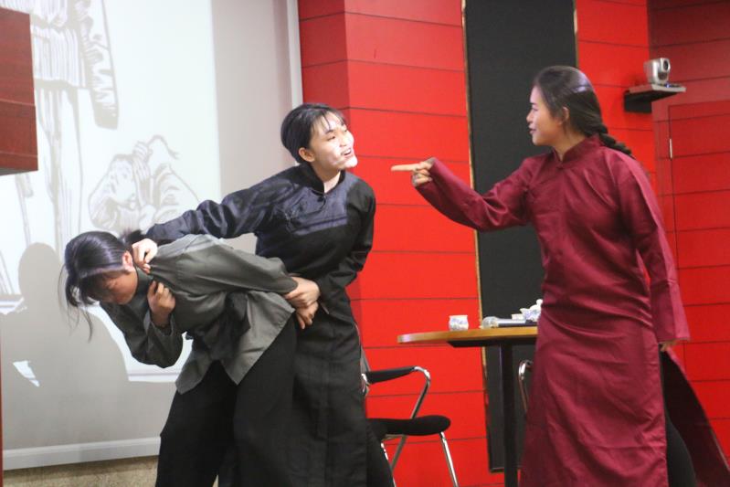展演活动由williamhill体育在线平台晓言相声小品协会友情助演的一个讨论鲁迅作品的相声开场。随后,史挥戈教授指导威廉体育williamhill汉语国际教育专业1601班全体同学,精心选取了鲁迅《长妈妈与<山海经>》《从百草园到三味书屋》《孔乙己》《阿Q正传》等多部经典作品片段,结合PPT的视频、flash动画、图片、对白等实时展示,以三幕话剧的形式,将鲁迅小时候的成长经历、著名的小说人物以及许广平、瞿秋白、萧红、萧军等与鲁迅息息相关的现代文学作家们一一呈现给大家。话剧展演间隙,还设置了串场互动环节,以鲁迅作品为主题开展了现场知识竞答。整个活动,会心的笑声、掌声、附和台词声不断。最后,全体参演同学以接力朗诵的形式,为现场师生带来了大段耳熟能详的鲁迅名言,并齐声合诵《自嘲》,把现场气氛推向高潮。