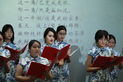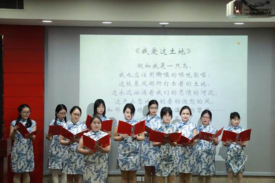 紧接着是诗歌朗诵《我爱这土地》和《我用残损的手掌》,同学们抑扬顿挫、声情并茂的诵读将诗人艾青和戴望舒的激愤昂扬和诚挚热烈的爱国之情生动地再现。