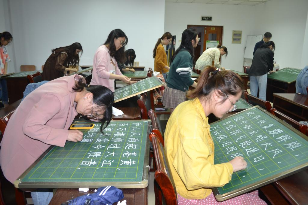 大赛以红色诗文为书写内容。在主持人宣布比赛开始后,现场气氛紧张热烈,同学们以饱满自信的姿态认真比赛,展示了各自的粉笔字书写功底。有的力透纸背、入木三分;有的清秀别致、下笔灵巧;有的行云流水、一气呵成;有的章法自然、笔意俊秀,充分展现了我院学子扎实的基本功和专业的书写能力。曲云进和郑可春两位老师于现场进行了书法展示,字体隽秀优美,笔走龙蛇,铁画银钩,为我们带来一场艺术的盛宴。同时,赛场的工作人员默默付出,提醒同学注意书写时间,积极为赛场的选手们解答疑问,维持了会场的良好秩序,使得大赛有序进行。
