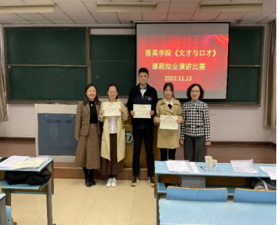 11月13日下午,2022年度菁英学院《文才与口才》课程结业演讲比赛在三江楼801顺利举办,该课程的教学及考核工作由威廉体育williamhill(语言文化中心)教学团队承担。威廉体育williamhill副院长、语言文化中心副主任余红艳,威廉体育williamhill副院长周渡,威廉体育williamhill徐光萍、谢佩佩老师,语言文化中心李红艳老师出席了本次演讲汇报比赛并应邀担任评委。