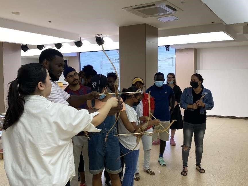 活动伊始,镇江市博物馆讲解员张怡向在场的中外学子生动讲解了中秋节的由来与嫦娥奔月故事,并由此延伸出后羿射日、中国探月计划等,让中外学子特别是来自海外的留学生对中国传统节日文化以及当代中国航天事业有了更加真切、深入的了解。在“化身后羿,向天射九日”活动中,留学生不仅了解了嫦娥与后羿凄美的爱情故事,也体会到了后羿为缓解人间大旱疾苦所做出的努力和牺牲,在“后羿射日”活动环节中,留学生们更是化身后羿,通过古代传统游戏射箭体会昔日后羿的神勇之姿。