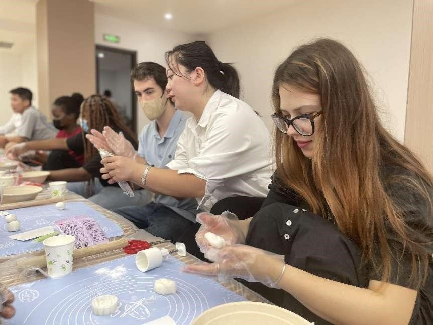 在“捧月入怀,冰皮月饼DIY”环节,同学们在随行老师和工作人员的帮助下亲手制作冰皮月饼,最后也品尝到了不同味道的月饼,让身处异国他乡的中外学生感受到了家的温暖。同学们认真听讲,愉快地与老师互动,现场氛围轻松活跃,同学们在欢声笑语中也对中秋团圆、丰收、祈福文化有了更深的了解和领悟。
