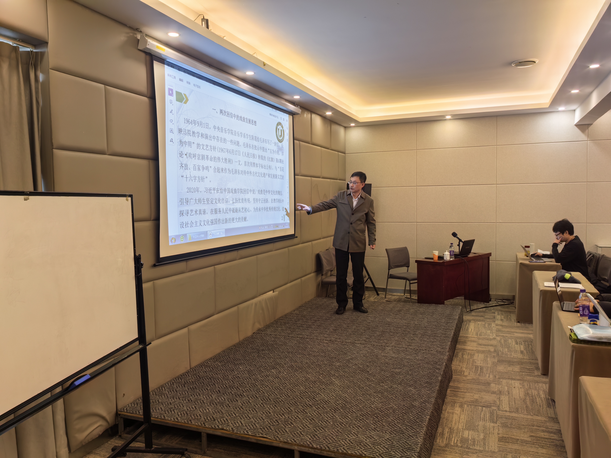 围绕习近平总书记给中国戏曲学院师生回信精神,结合毛泽东给中央音乐学院回信提出的“古为今用”“洋为中用”的文化发展方针,徐明君于1月27、28、29日连续进行了三场讲座。三场讲座主题分别为《“守正创新”与戏剧文化的“连续性”》、《从“三国戏”到“天国戏”——谈艺术创造性转化中的几个问题》、《“弘扬优良传统”与现代戏剧文明探索》。该系列主题讲座为徐明君主持的2023年度国家社科基金项目“太平天国与近代百年中国戏剧的本土现代性研究”阶段性成果汇报。这几场讲座梳理中国戏剧文化传统及其发展演变规律,文艺在社会变革时期的创造性转化内涵及其途径,从戏剧发展角度诠释“守正创新”等习近平新时代中国特色社会主义思想文艺理论的核心内涵。