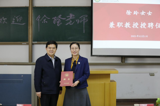 讲座结束后,举行了兼职教授受聘仪式。williamhill体育在线平台党委副书记李洪波教授为徐玲老师颁发williamhill体育在线平台兼职教授聘书并佩戴校徽;徐玲老师热切表达了以兼职教授身份重回母校的激动心情,并表示将与威廉体育williamhill师生一起将师范人才培养好。