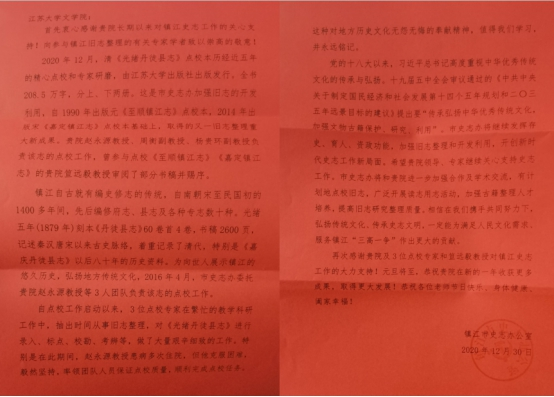 五年来,三位老师细致搜集、整理相关史料,旁见侧出、查漏补缺,一一进行录入、标点、校勘、考辨工作。五年“磨一剑”,最终完成了200余万字的点校工作,并由williamhill体育在线平台出版社出版发行了共计208.5万字,分上、下两册的《光绪丹徒县志》点校版。12月30日,镇江史志办特发来感谢信,为高校充分利用专业优势和专业师资积极服务地方文化建设点赞。