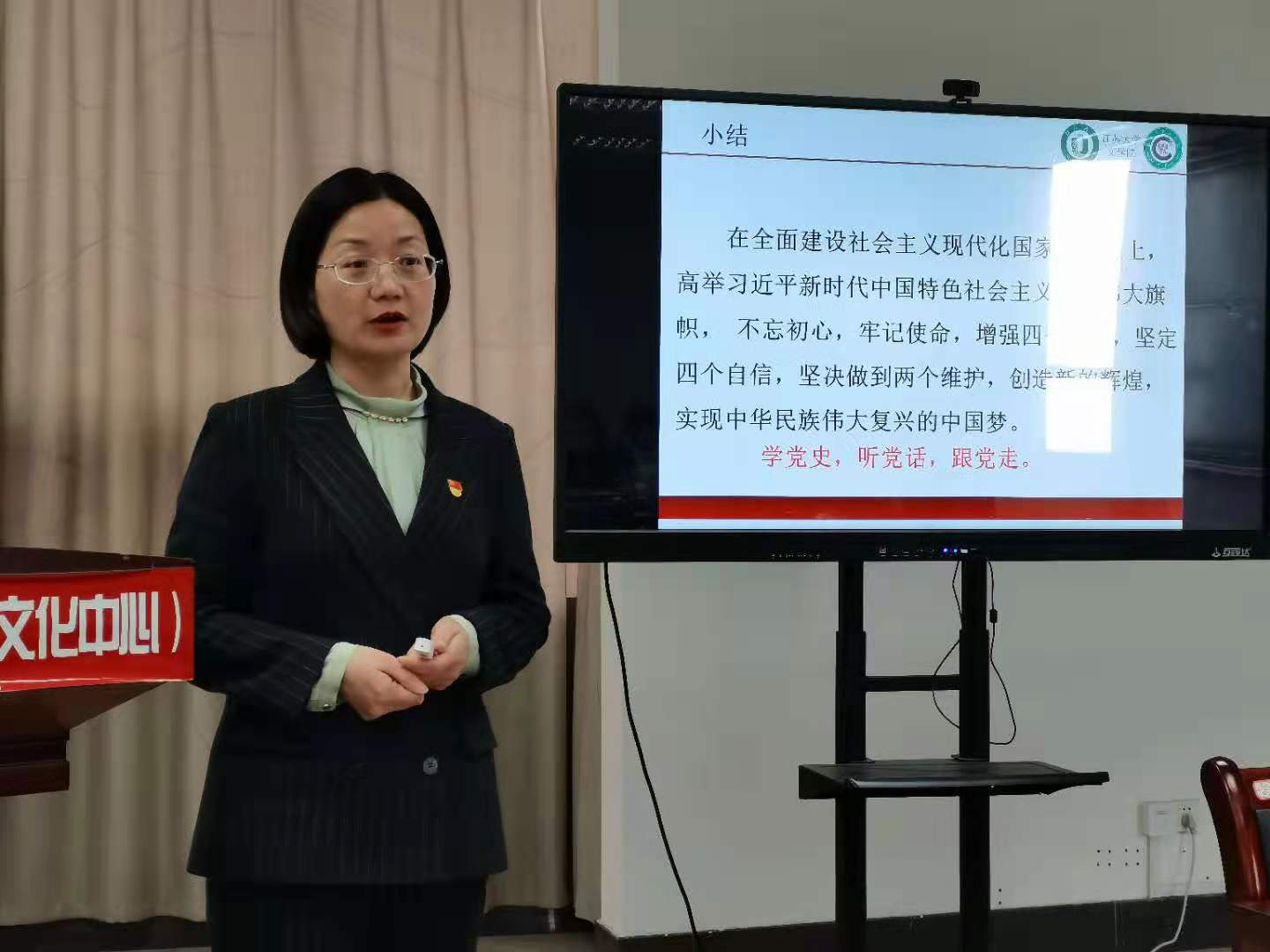 接着王彦梳理了关于100年党史的基本脉络。她向学生党员们介绍了100年党史时期的两种划分方法,并主要从建党伟业、革命建国、治国理政三个方面,图文并茂地阐述中国共产党的辉煌历史及重要历史事件对党的发展意义。党课最后,王彦强调了党的先进性与纯洁性,她表示:“只有中国共产党才能发展中国、强大中国,因此要坚定对中国共产党的信仰”。