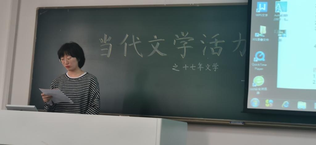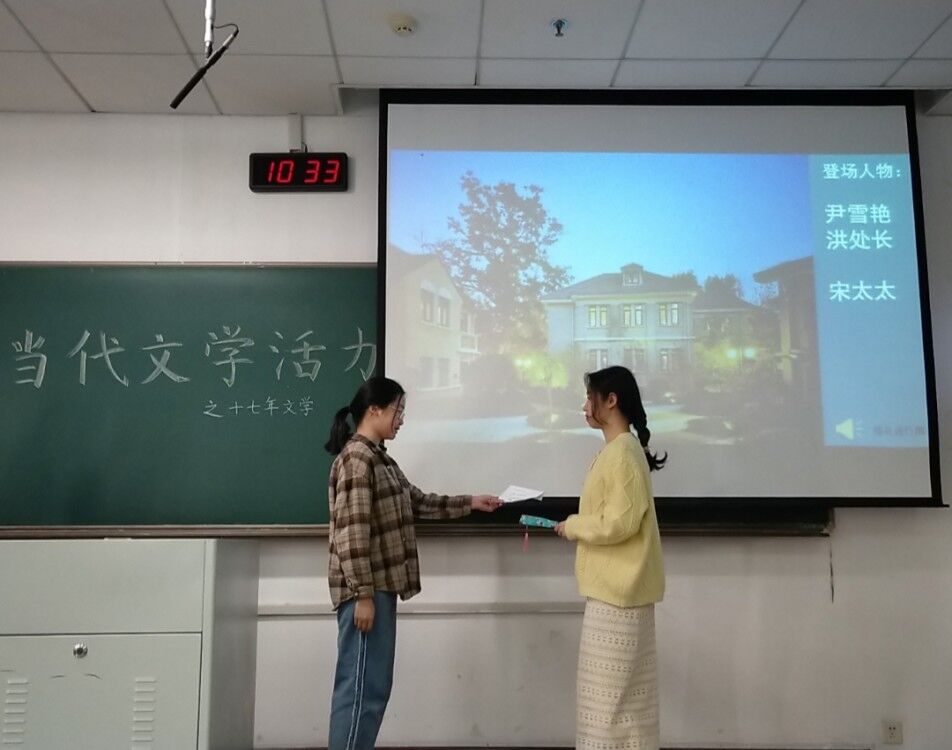活动伊始,主持人介绍本次活动的背景和目的。接着,参与活动的五组同学依次上台展示。其中,第一组同学以“卷文并茂,重回十七”为主题,将小组成员对《红岩》、《百合花》、《林海雪原》《一把青》的阅读感悟拍成视频进行展示;第二组同学用PPT汇报及情景剧表演的形式,展现了白先勇先生《永远的尹雪艳》中的场景;第三组则用PPT讲述了他们对十七年文学诗歌的感受,并朗诵食指的诗歌《相信未来》;话剧《龙须沟》由第四组同学表演,他们将自己的阅读感受融入表演中,观众均沉浸其中;第五组同学用PPT展示的方式讲述了他们对刘白羽散文的理解,尤其是《日出》、《长江三日》和《白蝴蝶之恋》三篇文章。最后,史挥戈老师作活动总结,她充分肯定了同学们的课堂展示效果,并对展示进行了点评。活动取得圆满成功。