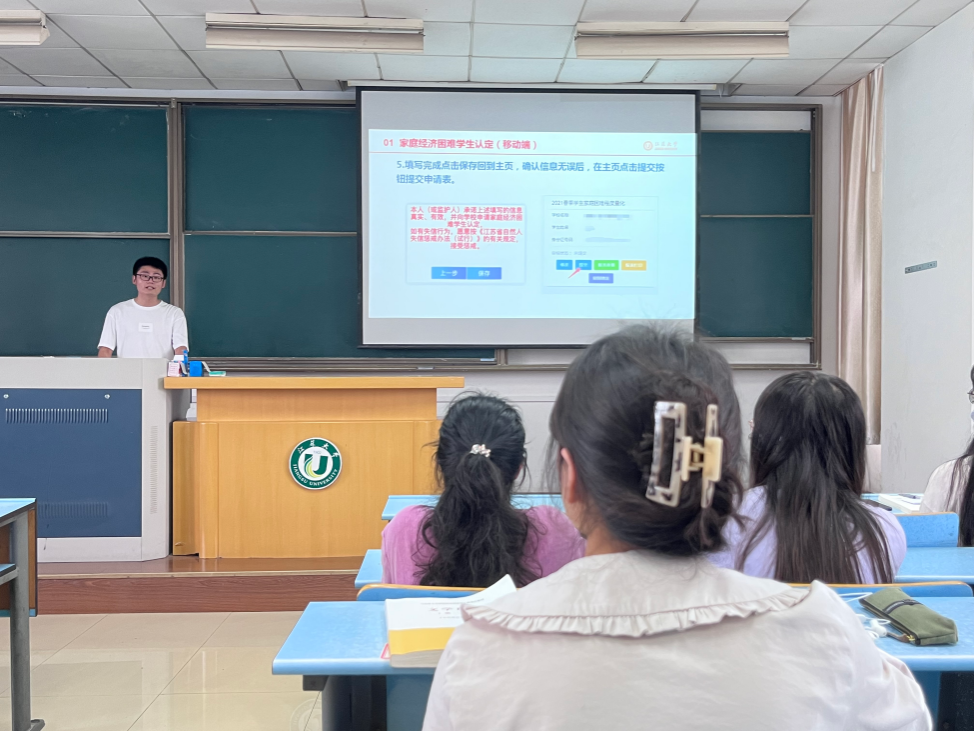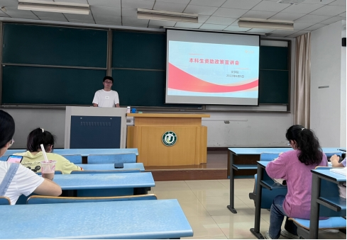 焦琨峰首先向同学们介绍了家庭经济困难学生认定平台和具体操作规范,帮助同学们解决认定过程中的切身问题。接着详细介绍了学校“八位一体”资助工作体系和海外交流项目资助政策,鼓励同学们走出校门,拓展视野,全面发展。最后围绕资助育人主题活动,分享成长故事,激励同学们在志愿服务中感恩奉献。