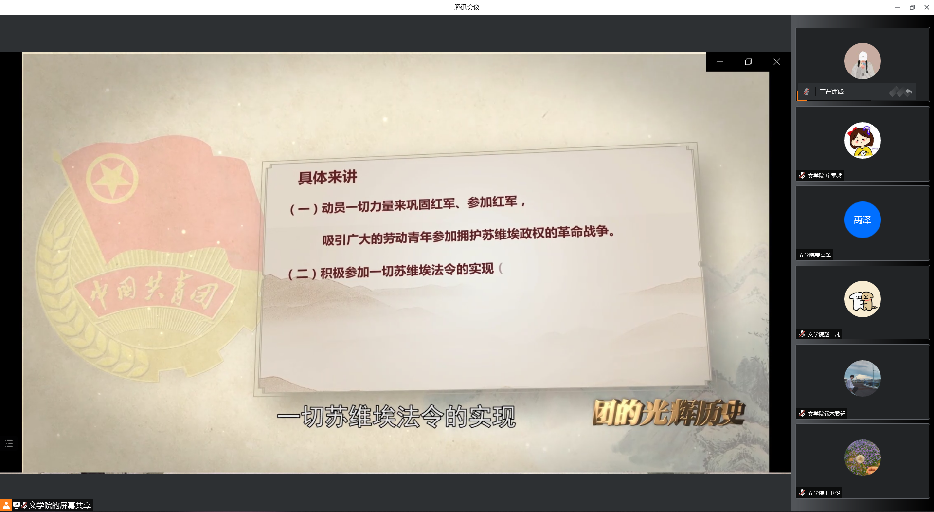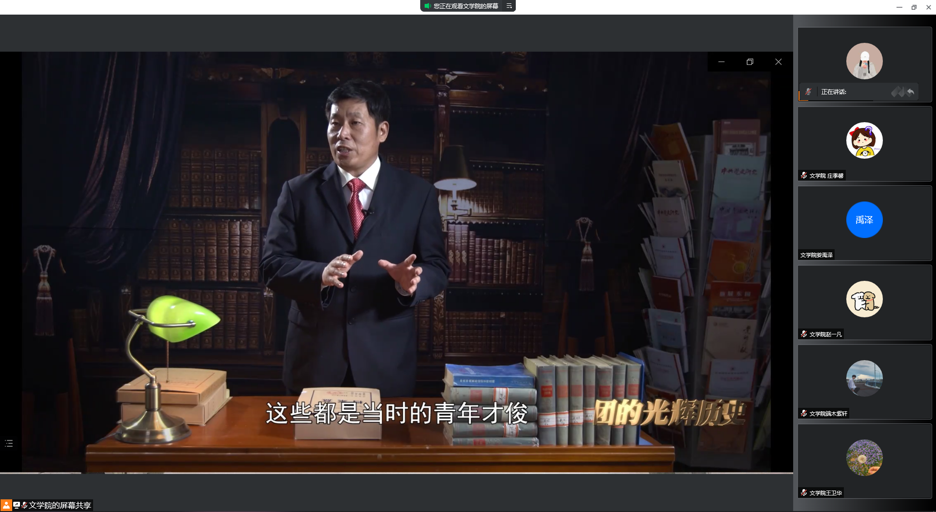 会议伊始,主持人进行团课主题介绍,通过视频带领同学们走进并了解中国共青团的光辉历史。接着,由共青团中央青运史档案馆常务副馆长胡献忠对中国共产主义青年团的意义做简要介绍,这一组织有理想,有信仰,既服务社会,又服务青年,与党同心,与党同行。然后,胡献忠先生回顾了中国共青团建立及发展的历史,带领同学们认识了中国共青团是在那个饱经风霜的年代,由中国共产党创立的富有新生力量的青年组织。再然后,胡献忠先生强调了中国共产主义青年团的群众性,使青年学生们意识到作为团员服务于社会,服务于大众的责任。团课的最后,由主持人做出总结,并积极鼓励同学们在生活实践中去承担作为中国共产主义青年团员的责任,听从党的号召,永远跟党走,积极上进,坚守初心,追求理想,为实现中华民族伟大复兴不懈奋斗。