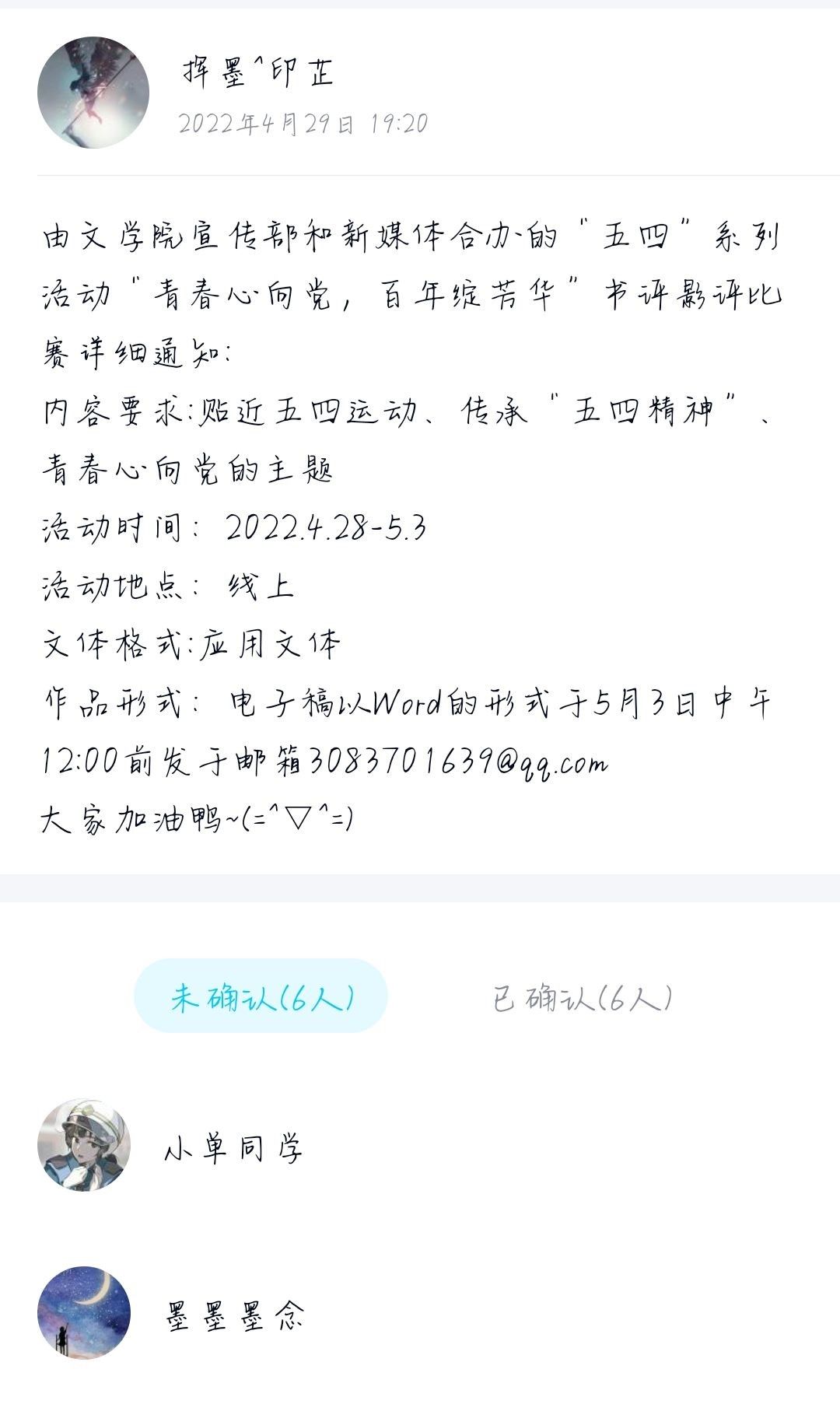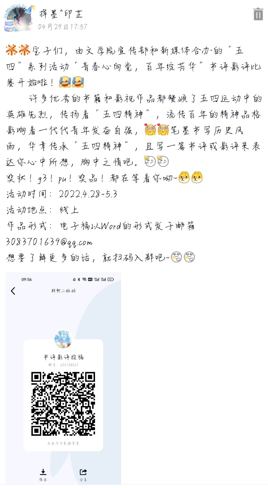 活动开始前,活动负责人通过QQ空间进行宣传,并创建群聊,做好前期准备。活动开始后,同学们积极投稿,观看《觉醒年代》《建党大业》等著名影视作品,阅读《重返五四现场》《五四运动史》等优秀书籍,创作书评影评。在创作的文章中,同学们表达内心感悟,抒发真挚情感。同学们以此为契机向英雄前辈们学习,认识到作为中国共青团的一员应当承担的责任,增强了当代学子的时代责任感,激励自我树立远大理想、不懈奋斗。参赛作品由评委进行打分之后,评出名次。至此,活动圆满结束。