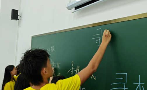 The campers rushed to pick up chalk and solemnly wrote the four characters "Roots Hunting Journey" on the blackboard, showing their Chinese proficiency and root-seeking feelings in both vertical and horizontal strokes.