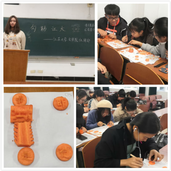 In order to strengthen college students' understanding and comprehension of the school motto and the school motto of jiangsu university, and deepen students' sense of belonging and mission to jiangsu university, the school of arts association department successfully held a carrot carving contest on November 23 in sanshan building 102.At 15:30 PM, the host will explain the background of the activity and the activity rules of carving carrots, and announce the start of the activity. This sculpture competition, by the participants free grouping, 3-4 people a group, creative, group carving. Write the school motto and college motto on the blackboard in advance. Each group was given two carrots, one knife, and an appropriate amount of seal cutting tools. Participants cut the carrots into appropriate shapes and carved out the content of the school motto with knives and other tools within the specified time. They were free to be creative and to join the font patterns. Finally, each group's entries will be displayed in turn, and the host will give the closing speech to announce the successful conclusion of the event. After the event, the judges evaluated the sculpture according to the degree of completion, clarity and other aspects of the work, and issued the certificate of merit.This activity is not large in scale, but it is better in creativity, and let students develop innovation ability in cooperation, and deeply understand the school motto, the school motto and the spirit of jiangda. Through the activities of the school motto and the school motto, the students of jiangda university can establish the emotional bond with jiangda university, strengthen their sense of identity with the spirit of the school and the school, develop the sense of innovation, strengthen the practical ability, comprehend the spirit of jiangda university, and show the good spirit of "jiangda people".