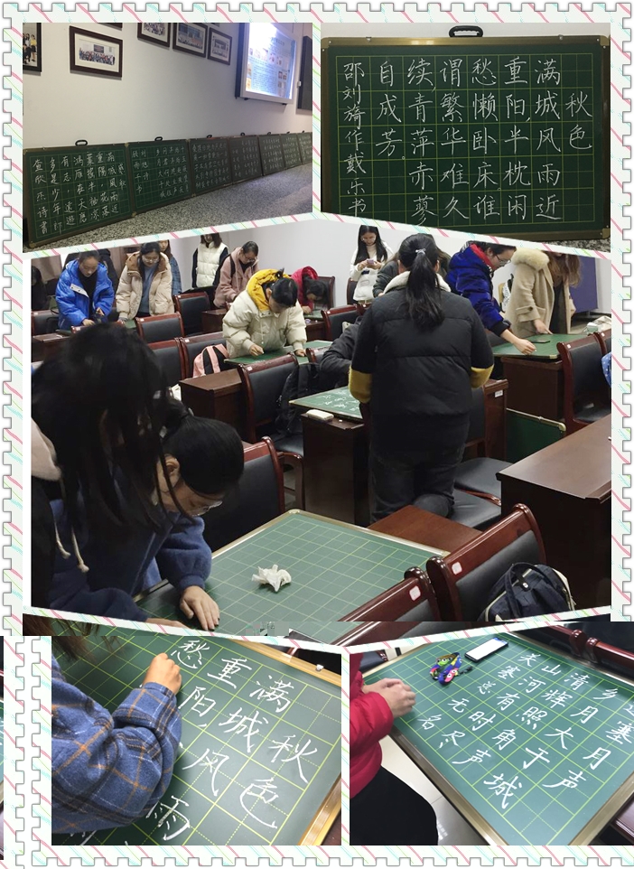活动开始前,周衡老师在课程结课时同学们上交的近体诗作业中,认真评选了优秀作品18首,并作为粉笔字书写展评的内容。活动当天下午在三江楼威廉体育williamhill901B报告厅,周老师组织报名参与活动的同学们有序领取小绿板,并结合个人的喜好自主选择一首作品进行现场书写。同学们一个个凝气聚神,小心平放好绿板,规范执笔,边欣赏近体诗作品,边认真书写起来。同学们或选取本人的作品,或选取同学的作品进行书写,有的选择田字格面、有的选择光面进行书写,教师指导交流的声音、相互评论赞赏的声音、粉笔与绿板摩擦的声音交织在一起,现场气氛热烈。书写完毕后,周老师又带领大家把小绿板整齐地摆放在学院走廊,开展为期一周的展评活动。