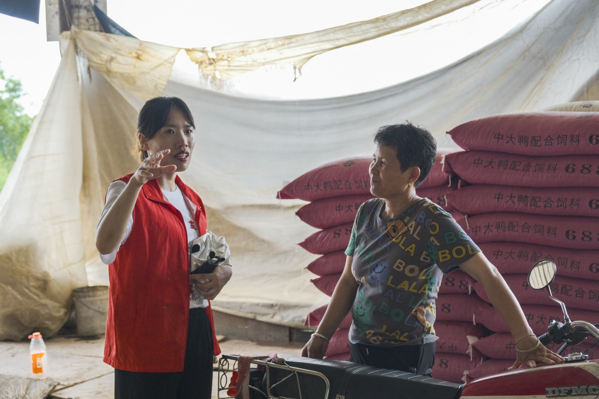 三友村党总支部副书记梁勇昌、驻村工作队员玉欢爽带领志愿者们 “走村入户”,探索村民们的脱贫故事。六瓢屯贫困户陈国标夫妇承包养鸭场,原驻村第一书记李峰多次视察,并参与养鸭场建设、规划。在政府全力支持下,陈国标夫妇脱贫致富,即将开设第二个养鸭场。阿婶告诉志愿者自己抗癌6年,曾独自住院51天,目睹病友相继离去。是国家医保政策帮助阿婶重燃生活希望,阿婶现在积极乐观,已与“常人”无异。“我以前是贫困户,在政府帮助下,我开了这个养鸭场,现在还有医护人员定期给我上门体检。我对现在的生活感到满足,你看,现在路修得很好,孩子上下学方便很多,以前住的泥瓦房现在也变成了平房,还建了篮球场,感谢党和国家的好政策,让我们过上了好生活。”阿婶感慨道。