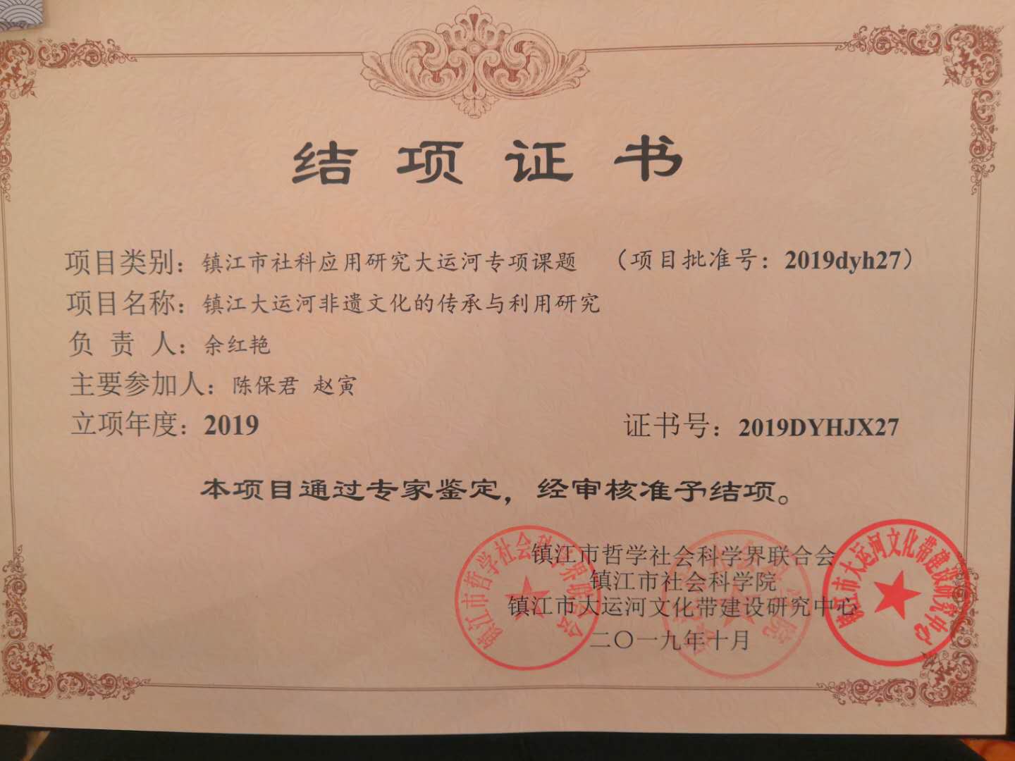 余红艳-陈保君-赵寅+镇江社科应用课题大运河专项结项证书-2019